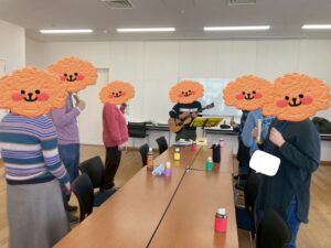 おやつのあとはソング大会。「幸せなら手をたたこう」から始まりアニメの曲など竹のシェイカーを鳴らしながら歌ってあっと言う前に時間が過ぎました。