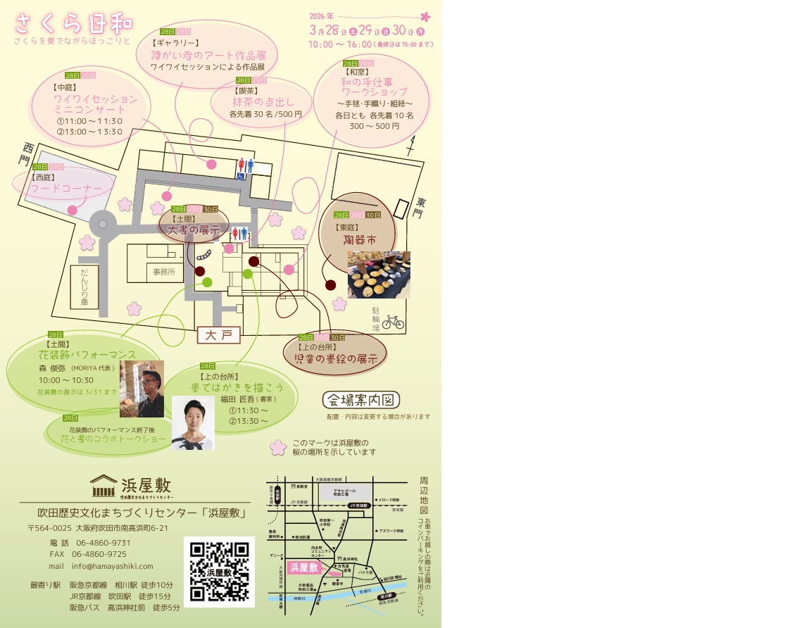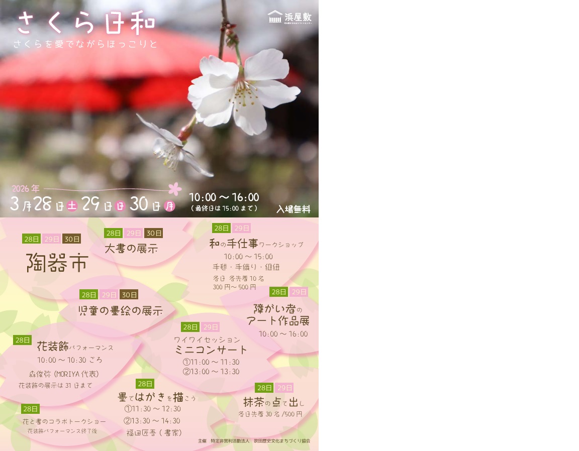 ワイワイセッションは、3月28日と29日に、浜屋敷で行われる「さくら日和」のイベントに参加します。 作品展示、物販、点字体験コーナー、コンサートを行います。 皆様ぜひお越しください( ^)o(^ )